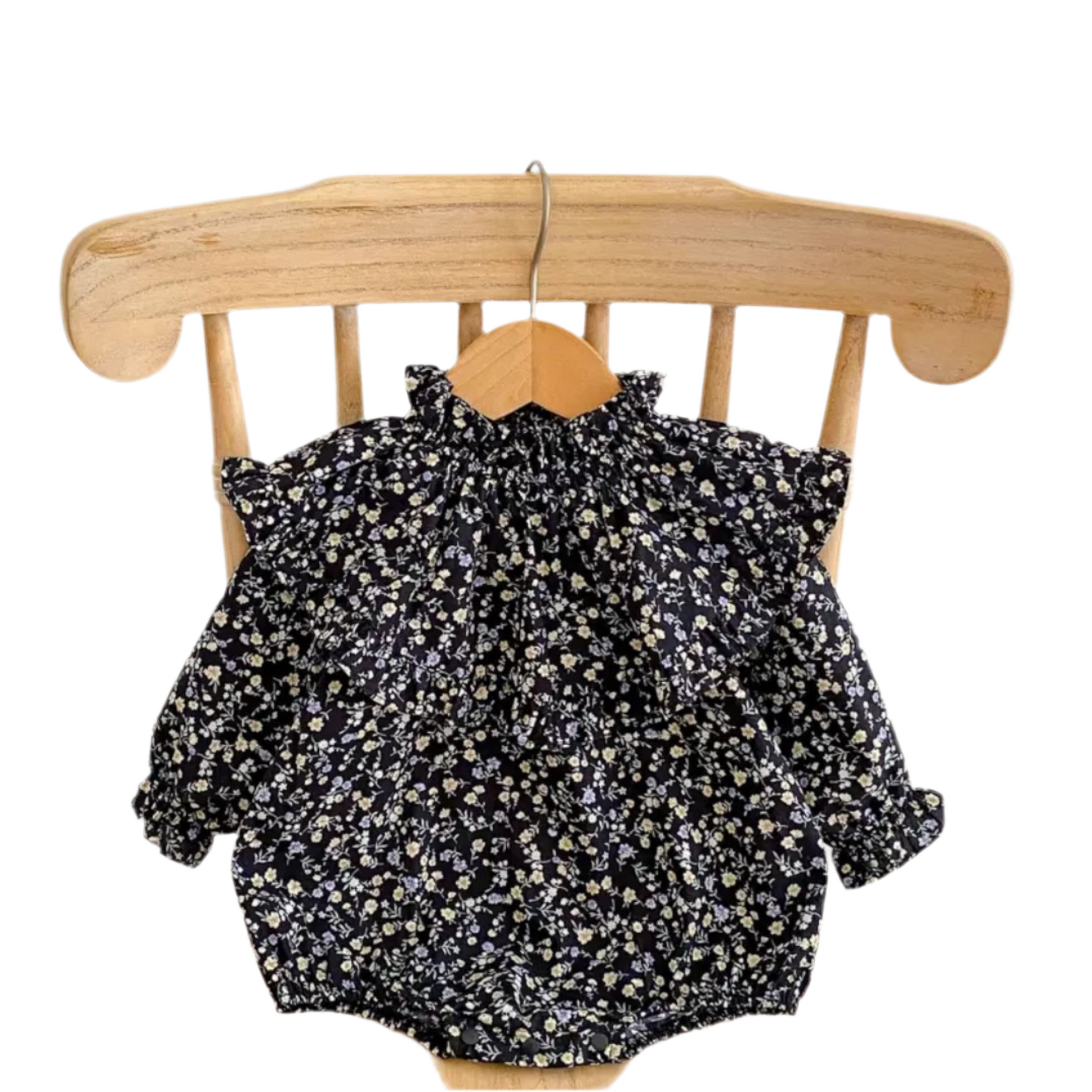 This adorable black romper features a sweet frill collar detail that adds a touch of charm to its stylish design. The romper is beautifully adorned with a delicate cream and baby blue floral print, bringing a soft, feminine feel to the look. Perfect for any occasion, it combines comfort and style with its easy fit and breathable fabric. The frilled collar enhances its playful, yet refined appearance, making it a lovely choice for casual outings or dressier events.