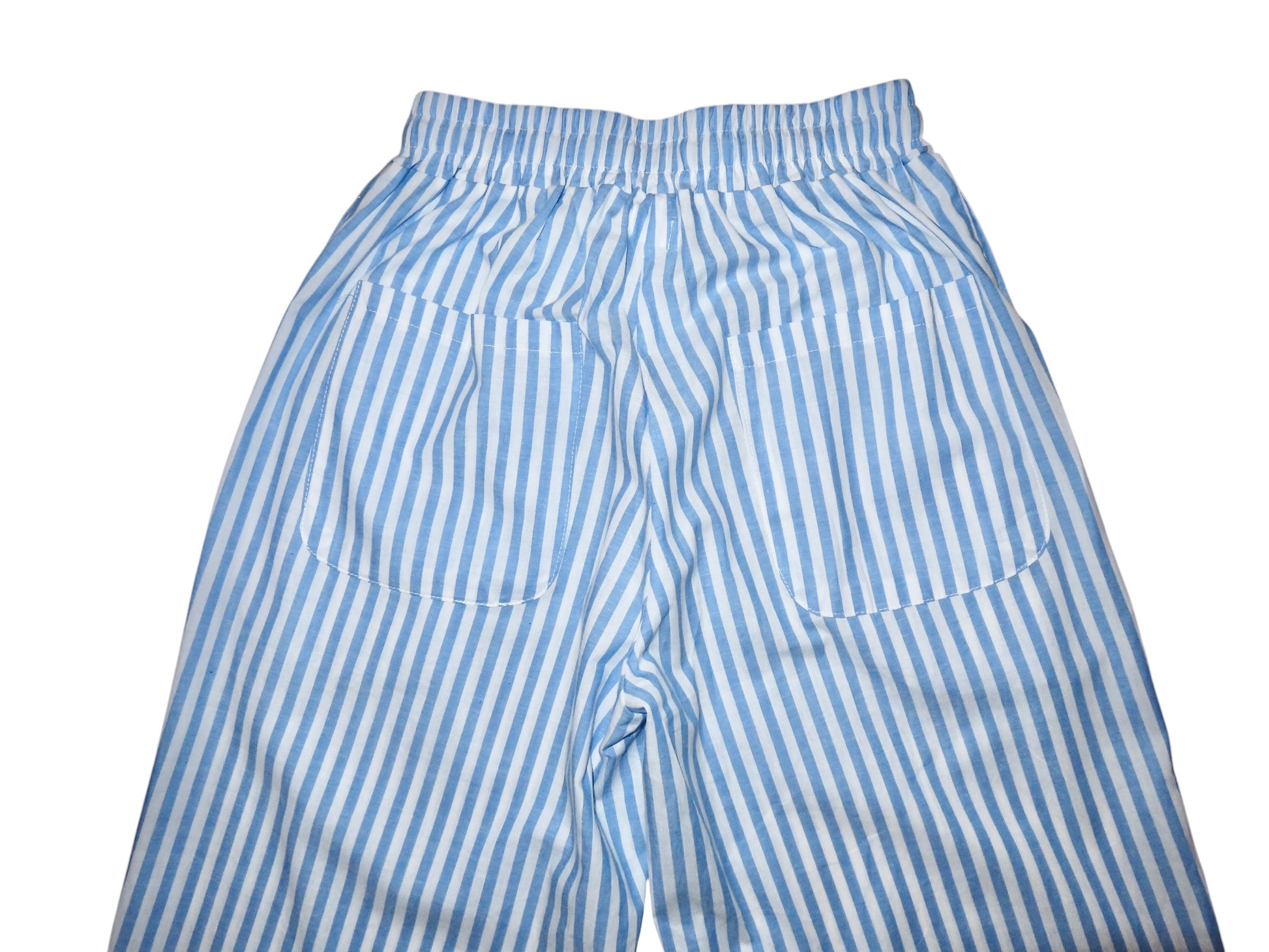 Meet the Milo trousers—your new everyday essential in a soft white and baby blue stripe. Designed with an oversized relaxed straight-leg fit (more of a wider fit in the adult style), an elasticated waistband with a functional drawstring, and pockets at both the front and back, these trousers balance comfort and effortless style for all ages.