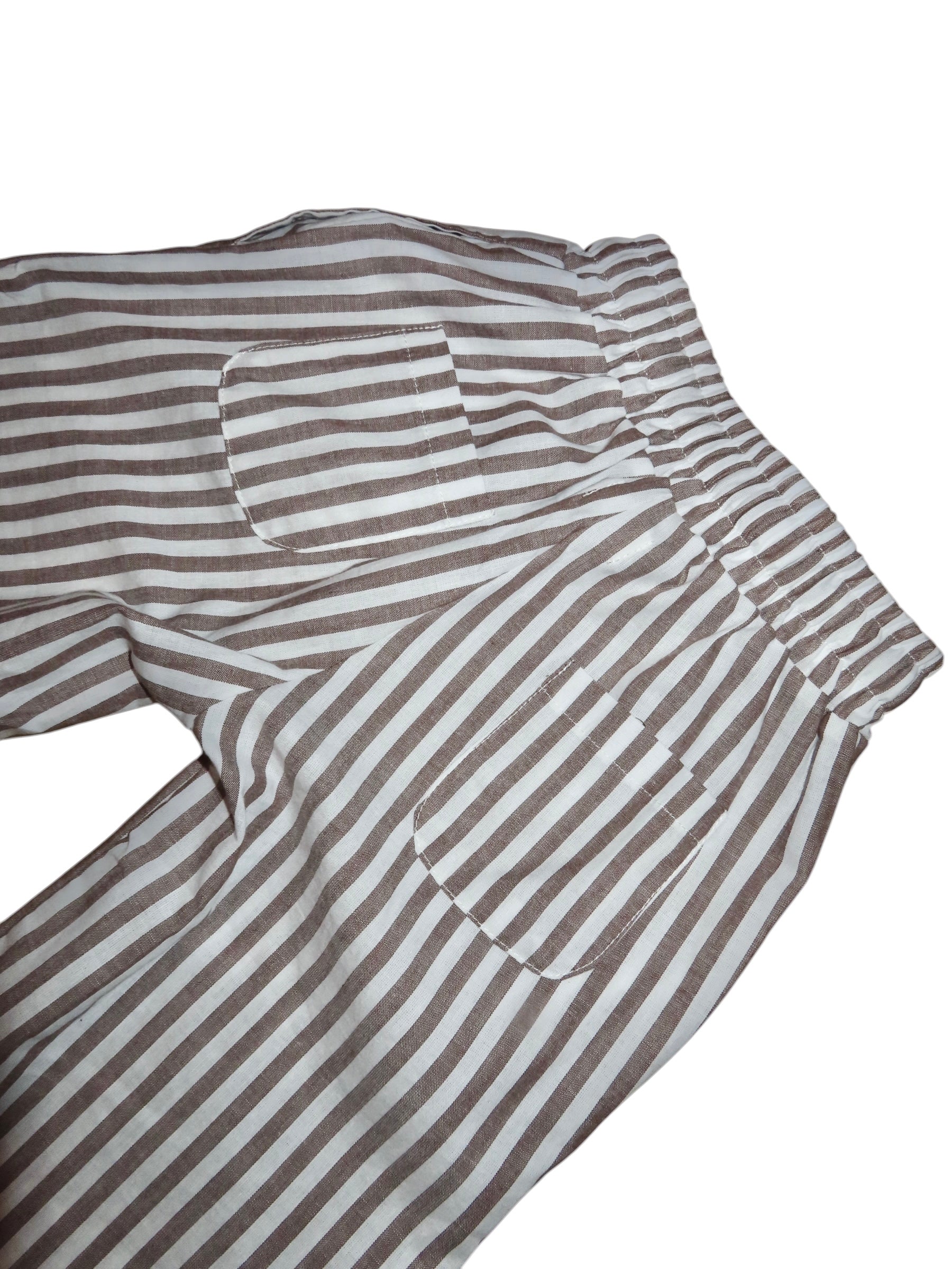The Milo trousers are an everyday essential designed for comfort, ease, and effortless style. Crafted from 100% lightweight cotton in a soft white and brown stripe, they feature a relaxed straight-leg fit, elasticated waistband with a functional drawstring, and practical pocket details at the front and back.